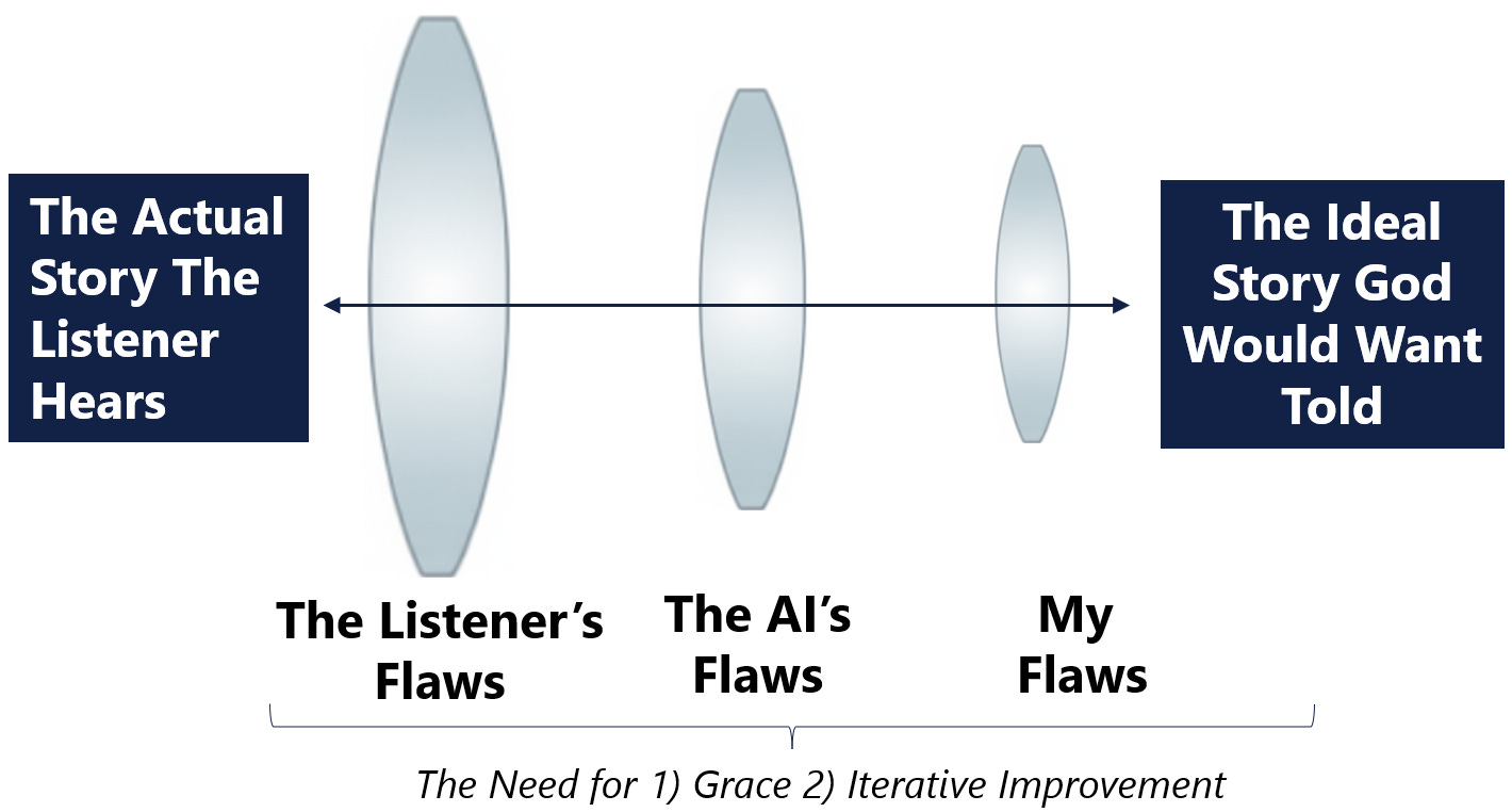 Paul said in 1 Corinthians 13:12 that we all “See through a glass, darkly” (listen to a more in depth discussion on this in Episode 7). Based on this, I would like to propose a model for humility and grace in this project as shown above. We start with the ideal story God would want told for His purposes. That unfortunately goes through the dark glass of my own flaws. Then if I’m using AI for a component, it goes through the AI’s flaws. Then finally it goes through the listener’s flaws.